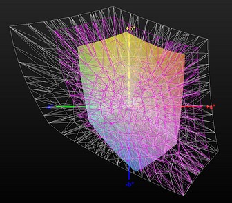 The above images are screen shots from a 3D plot that compares the color gamut of my Lenovo T60 Thinkpad with sRGB and Adobe RGB (1998). The large white wireframe plot is Adobe RGB, the magenta wireframe plot is sRGB, and the solid color plot in the middle is my T60 Thinkpad. Yes, the T60's gamut is considerably smaller than sRGB. While the 2D screenshots are all well and good the 3D VRML version is much better, because you can drag the model around so you can view it from any angle, not just the two angles that the above images show. And nobody has to manually make screenshots.
